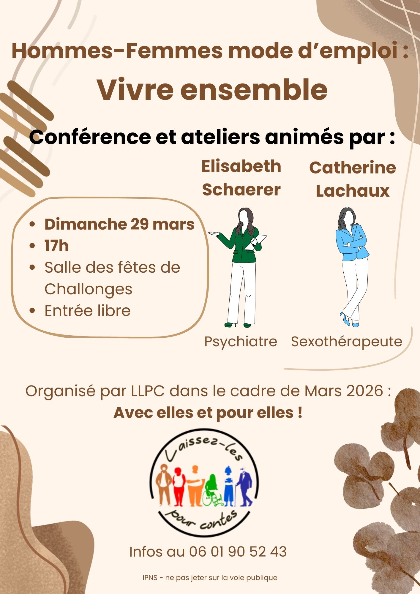 Hommes-Femmes : mode d'emploi : vivre ensemble, conférence & ateliers animés par Elisabeth Shaerer, psychiatre et Catherine Lachaux, sexothérapeute. Organisé par LLPC.